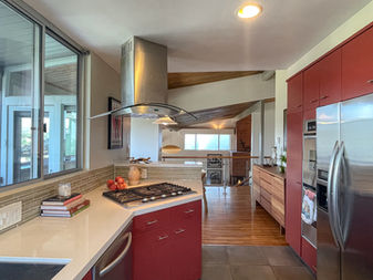 From the moment you enter this mid-century post-and-beam home, designed by noted architect Jack Chernoff AIA, you will be struck by dynamic lines and expansive views. Commissioned c. 1956, this sensitively designed, light-filled, split-level home showcases 180-degree western views from the Wilshire skyline to Griffith Park and the Hollywood Sign. The intimate den with custom inlaid wood floor leads to a private patio surrounded by bamboo: the perfect place for morning coffee. Step down into the dramatic vaulted ceiling living room, and enjoy the two-story brick fireplace with open hearths. This home features three generous decks for relaxing outdoors. The deck off the dining room and kitchen has a built-in BBQ and bar top for entertaining and enjoying unforgettable sunsets year-round. The open kitchen features quartz counters and restored original St. Charles cabinets. The aquamarine mosaic-tiled main level bathroom creates a spa escape by combining an expansive picture window to the private patio, vaulted wood-paneled ceiling, skylight, and sunken tub. Downstairs are two bedrooms with floor-to-ceiling sliding glass doors, accompanied by a second full bathroom. The large utility and laundry room, with surrounding windows, is perfect for an art studio. Located in the hills of Silver Lake on a quiet street, with parking for up to four cars. Street-to-street lot with mature trees and landscaping. A short tour to some of the best local spots: LAMill Coffee, Alimento, Botanica, L & E Oyster Bar, the dog park, reservoir, and meadow.