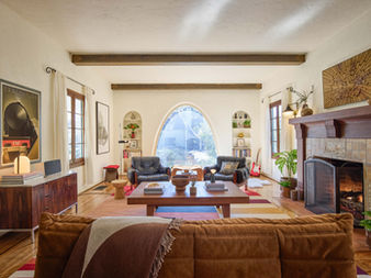 Experience this thoughtfully restored and upgraded 1930s Spanish Colonial Revival, nestled in the coveted Verdugo Woodlands neighborhood. A private walled front courtyard shaded with mature lime and lemon trees welcomes you, with the original wood front door opening onto the elegant entry hall. Arched doorways lead off the entrance into an expansive living room on the left and formal dining room on the right. The light-filled living room features restored hardwood floors, hand-hewn mahogany fireplace with Claycraft tiles and hand-painted wood ceiling beams. A large arched picture window frames a peaceful view onto the mature native plant front garden. Space-defining lighting from Isamu Noguchi, Charlotte Perriand, Poul Henningsen and others is featured throughout the house, with a vintage Mission style wrought iron chandelier dramatically illuminating the stairwell.