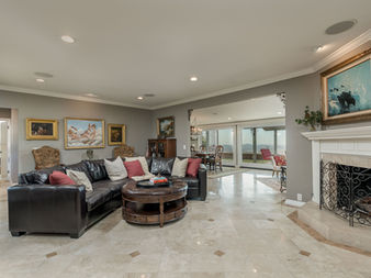 A gated courtyard opens to a peaceful fountain and seating area, perfect for quiet mornings and sunrises. Inside, a welcoming foyer leads to a large living room with a garden window and gas fireplace. From there, the space flows into a family room and dining area with floor-to-ceiling windows framing the pool, patio, and western vistas.