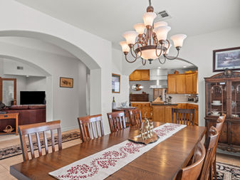 Inside, the gourmet kitchen features high-end stainless-steel appliances, a center island, breakfast bar, and oak cabinetry — all designed with entertaining in mind. A formal dining room sits adjacent, ideal for hosting large gatherings. The family room is warm and welcoming with two-story ceilings and a dramatic stone fireplace as its focal point.