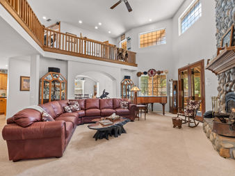 Two spacious bedrooms on the main floor share a full bath. Upstairs, a large open loft offers space to relax and entertain — complete with a built-in bar, lounge seating, room for a pool table, and sweeping valley views. The primary suite includes its own private sitting area, a spa-style bath with walk-in shower and soaking tub, and a generous dual-entry walk-in closet. Step onto the private balcony for views of blue skies, mountain ridgelines, and winter mornings dusted with snow.