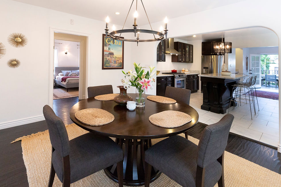 This Spanish architectural home, built in 1923, has been tastefully remodeled with modern touches that aim to please. Enter the sun-drenched living room with three large arched windows facing the front garden and cozy up to the gas log fireplace. The open floor plan immediately takes you through the dining room into the oversized chef's kitchen with honed Carrera marble counters and a statement vintage center-island bar. The large pass-through to the back deck and garden has a built-in desk, double closets, and a washer and dryer neatly tucked under cabinetry. Hardwood floors, custom window treatments, and a remarkable amount of closet space are offered in all three bedrooms. Two bathrooms have been tastefully remodeled in keeping with the kitchen design and Spanish architecture. Both the primary bedroom and utility area off the kitchen leads out to the rear garden through a French door. The back deck is the perfect space for outdoor dinners and the garden offers an additional peaceful setting amongst lush, tropical landscaping. The two-car detached garage or possible future ADU offers great additional space. The long driveway with stamped concrete offers bountiful off street parking both in front and behind a gate. Located just north of Melrose, there are so many great shops and restaurants to be enjoyed, yet one feels tucked away in their own private paradise. It's a perfect balance after all.